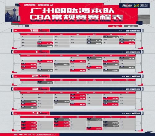 因广州龙狮主场比赛场馆举行政府大型活动,个别场次无法按计划举行,经CBA公司审核同意,现将赛程中部分场次调整如下: 1.CBA联赛常规赛第二轮龙狮对阵山东的比赛日期由原2025年12月15日调整至2026年3月5日; 2.2025年12月19日CBA联赛常规赛第三轮龙狮对阵广东的比赛,与2025年12月23日CBA联赛常规赛第五轮广东对阵龙狮的比赛主客场对调。 更新版赛程表见下图: