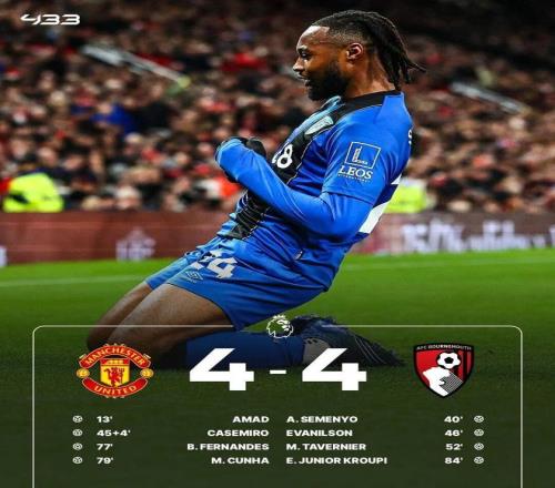 下半场,伯恩茅斯短时间内由埃瓦尼尔森、塔韦尼耶连入两球,B费任意球直接破门追成3-3。随后,库尼亚进球,曼联4-3反超比分。克鲁皮替补登场,为客队再度扳平比分。最终曼联4-4伯恩茅斯。一场进球大战后,双方4-4平分秋色。